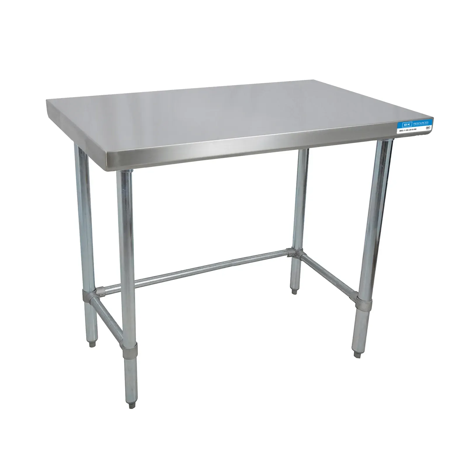 Introducing the BK Resources VTTOB-1848 Work Table, the perfect addition to any commercial restaurant kitchen. Designed to help you dominate the culinary world, this work table is built to withstand the demands of a busy kitchen. The 48"W x 18"D stainless steel top provides ample space for food preparation, while the turndown edges on all sides ensure a clean and safe working environment. Reinforced with channels and supported by 1-5/8" dia. galvanized legs, this work table is sturdy and durable. The open base with galvanized side and rear bracing adds extra stability, and the adjustable high-impact corrosion-resistant feet allow for easy leveling on any surface. With its NSF certification, you can trust that this work table meets the highest standards of cleanliness and sanitation. Upgrade your kitchen with the BK Resources VTTOB-1848 Work Table and experience the difference in efficiency and productivity.