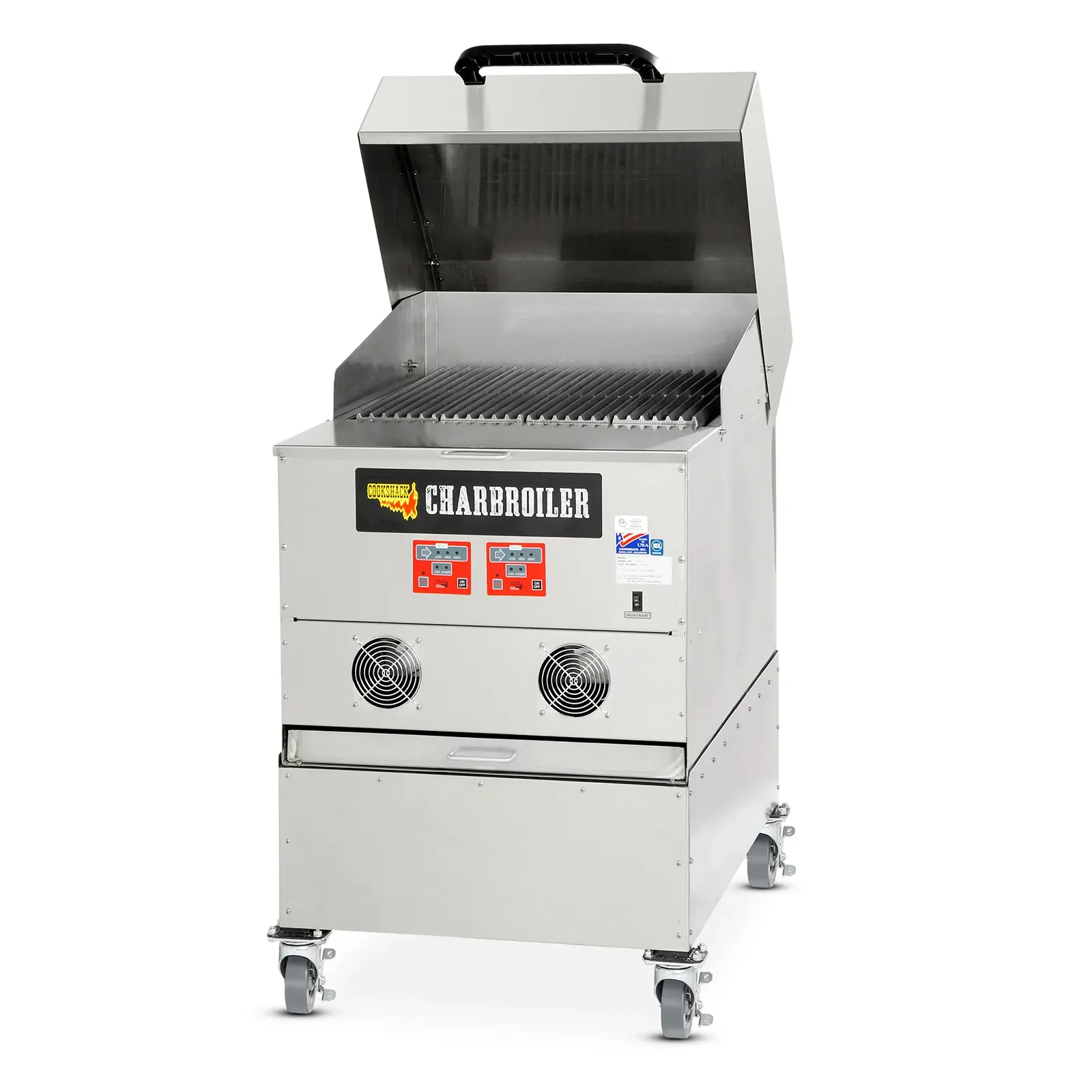 Enhance your culinary space with top-notch tools. Introducing the Cookshack CB024 Charbroiler, Wood Burning. This commercial-grade charbroiler is designed to elevate your restaurant's grilling game. With its 480 sq. in. cooking area and four heavy-duty cast iron grates, you can cook up a storm and cater to large crowds effortlessly. The temperature control ranges from 250 F to 700 F, allowing you to achieve the perfect sear on steaks, burgers, and more. Equipped with two digital controllers and firepots, this charbroiler ensures precise heat distribution and consistent results. The double-walled stainless steel construction guarantees durability and easy maintenance. The 40 lbs. hopper and drip tray make it convenient to use, while the optional lid adds versatility to your cooking options. NSF, cETLus, and cWHus certified, the Cookshack CB024 is a reliable and efficient addition to any commercial kitchen.